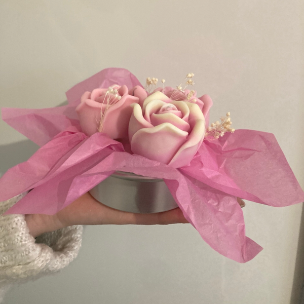 Le mini bouquet est sous forme de plusieurs bougies en forme de fleurs qui peuvent être retirées pour être alumée.